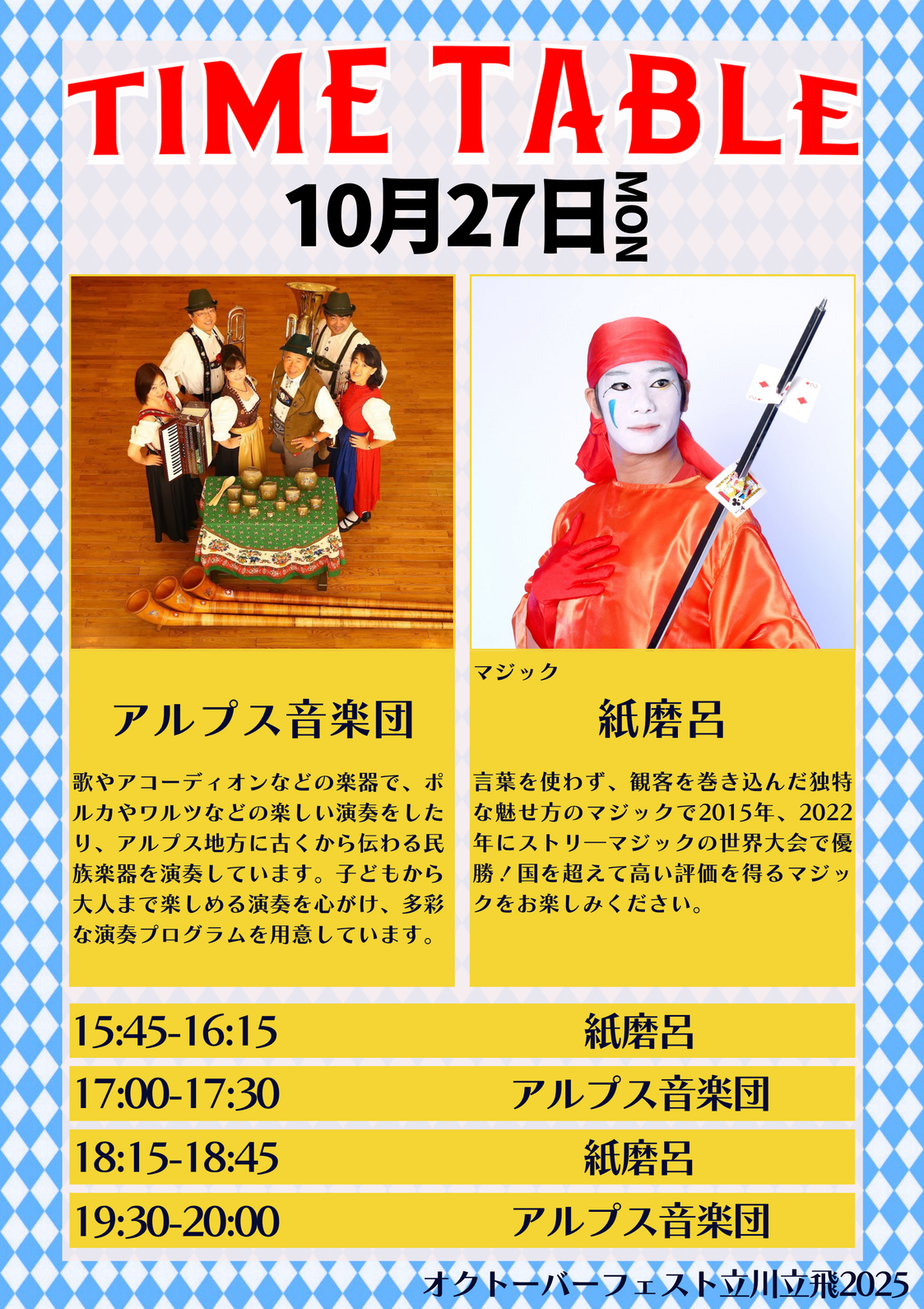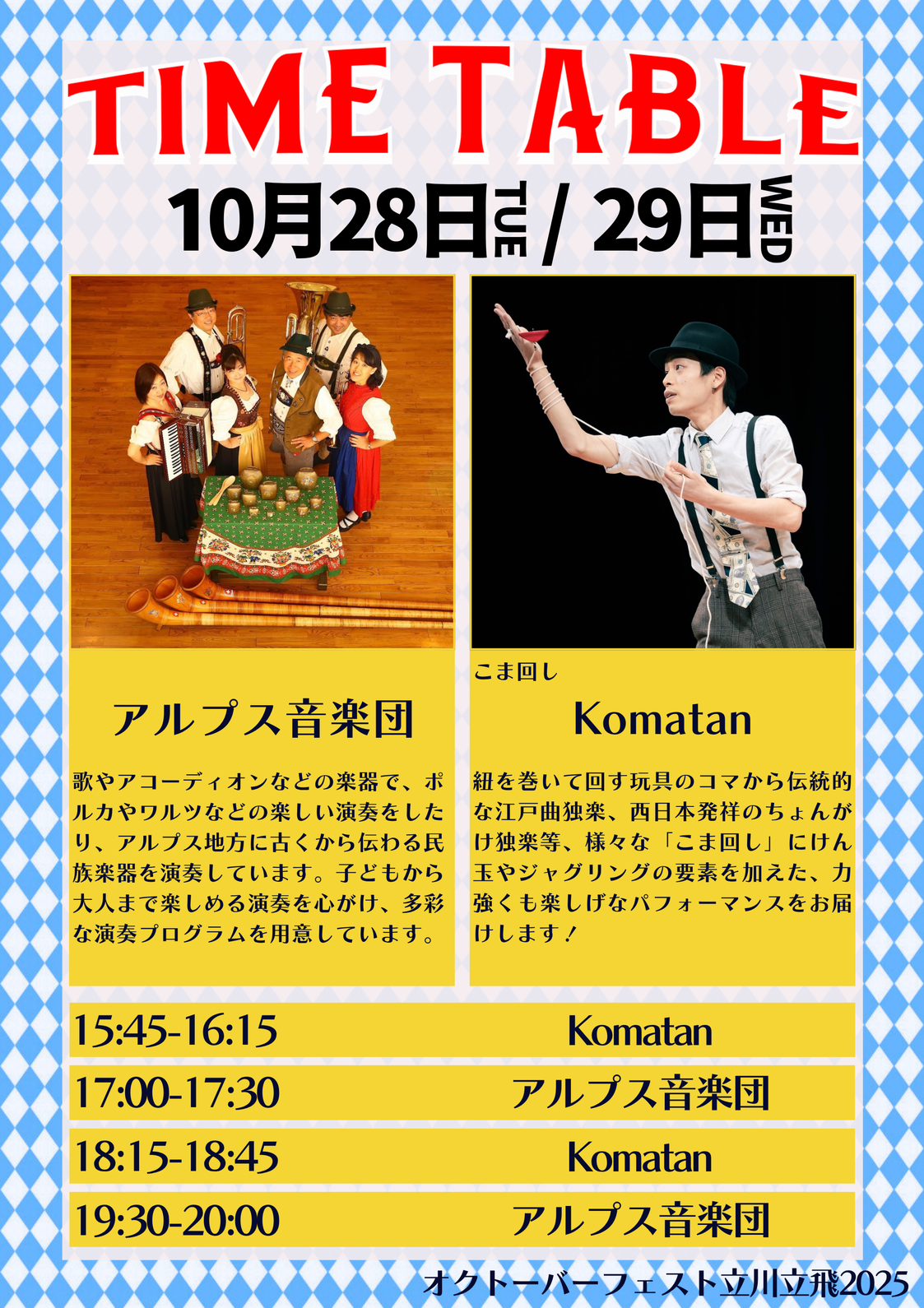 歌やアコーディオンなどの楽器で、ポルカやワルツなどの楽しい演奏をしたり、アルプス地方に古くから伝わる民族楽器を演奏しています。子どもから大人まで楽しめる演奏を心がけ、多彩な演奏プログラムを用意しています。